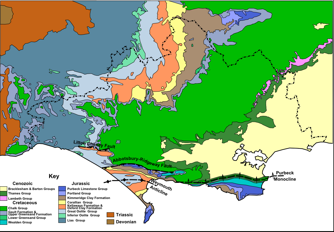 There is an additional older stone bed, from the Portland group, that runs along the coast between Durlston Head and St Albans Head.